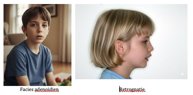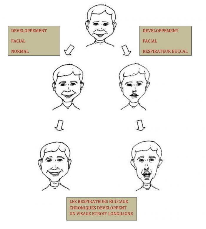 Il est capital de comprendre que l’obstruction nasale chronique a des conséquences majeures à moyen terme sur la croissance maxillo-faciale de l’enfant ,avec le développement d’un visage étroit longiligne («long face syndrome»).Obstruction nasale chronique = respiration buccale = anomalie du tonus facial = anomalie de position de langue= défaut de développement maxillo-mandibulaire.La langue est un peu le maçon du visage, sa position collée au palais derrière les incisives exerce une pression vertueuse sur le palais, le maxillaire supérieur et la mandibule.Après 12 ans la plupart des sutures osseuses sont soudées et il n’est plus possible d’influencer la croissance maxillo-faciale. Il est alors parfois nécessaire de recourir à la chirurgie stomatologique.