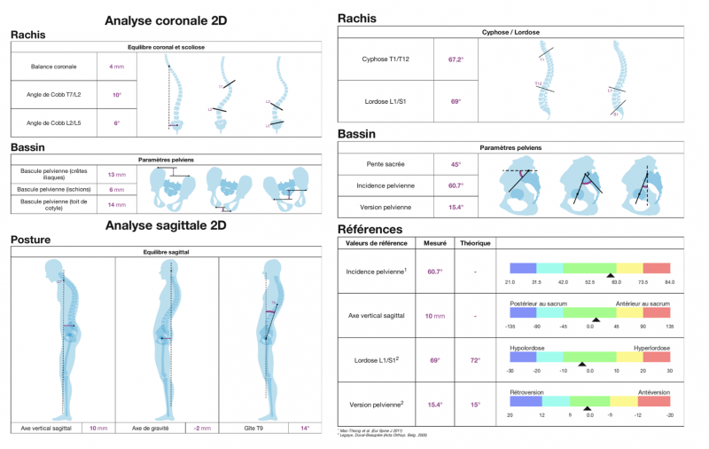 Figure 6: Exemple d’analyse des membres inférieurs permettant à la fois des mesures d’inégalité de longueur, mais également des analyses angulaires du bassin, des hanches, des genoux, et de la statique globale des membres inférieurs de face et de profil.