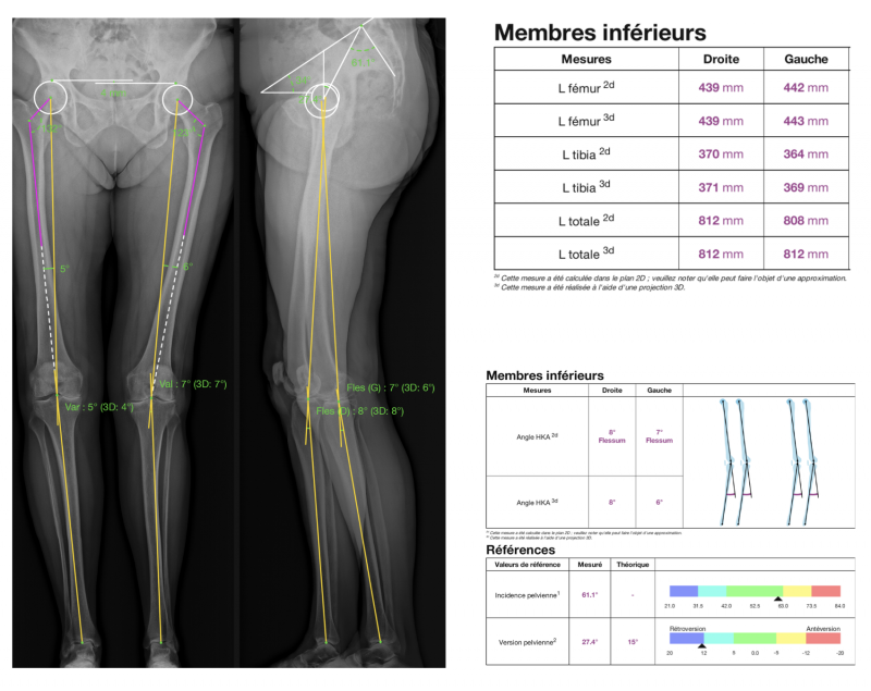 Au-delà du rachis, l’EOS a trouvé sa place dans l’analyse du bassin et des membres inférieurs. L’examen en charge révèle les interactions entre la morphologie pelvienne, les axes mécaniques des fémurs et des tibias, et la répartition du poids corporel. On peut mesurer les angles de varus ou de valgus, les torsions fémorales et tibiales et surtout les inégalités de longueur des membres. Une différence de 10 mm ou plus est généralement considérée comme cliniquement significative : elle peut s’associée à une bascule pelvienne voir une scoliose compensatrice.