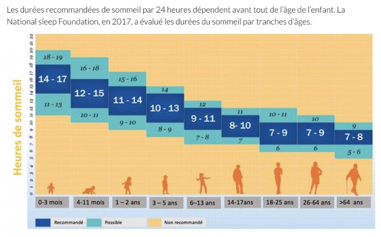 Le temps de sommeil diminue progressivement avec l’âge pour se stabiliser adulte jeune.