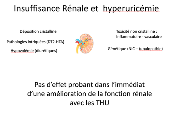 - Le risque rénal de l’hyperuricémie : le risque lithiasique et son traitement, le risque d’insuffisance rénale et la place potentielle préventive des traitements hypo-uricémiants, les précautions thérapeutiques qu’induit l’insuffisance rénale dans l’utilisation des traitements de l’hyperuricémie