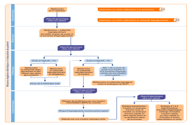 Les dernières recommandations en vigueur provenant de la HAS concernant la prise en charge médicamenteuse du diabète de type 2 datent de mars 2013.Il s’agit toujours d’une approche « gluco-centrée », ne prenant pas en compte le profil du patient et ses comorbidités pour les choix thérapeutiques. En effet, en cas d’échec des règles hygiéno-diététiques et de la metformine en monothérapie, la bi thérapie « imposée » au clinicien consiste en l’ajout d’un sulfamide hypoglycémiant pour obtenir l’objectif d’hémoglobine glyquée.