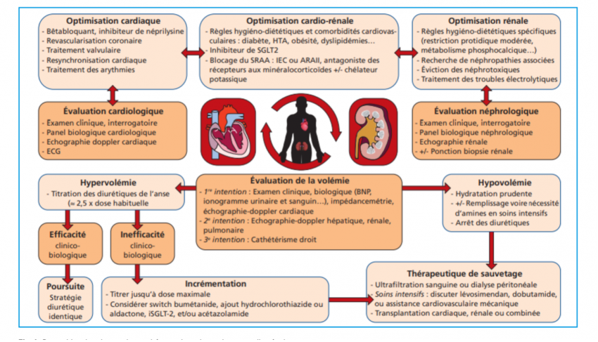 L’objectif principal de la prise en charge du syndrome cardio-rénal de type 2 reste la prévention de l’apparition de l’insuffisance rénale. Dans un 1er temps, en limitant les agressions rénales secondaires. Par conséquent, l’utilisation des thérapeutiques classiques dans l’insuffisance cardiaque devra se faire avec prudence (par exemple : diurétiques et hypovolémie, bloqueurs du SRAA et hypotension) afin de ne pas aggraver les processus physiopathologiques vus précédemment. Dans un 2nd temps, en luttant contre la congestion rénale. L’utilisation des diurétiques joue alors un rôle central dans la stratégie thérapeutique.
