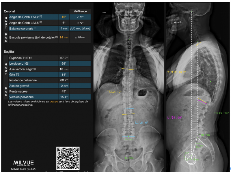 Les comptes rendus EOS peuvent impressionner par la profusion de chiffres et d’angles. Pourtant, leur logique est simple dès qu’on connaît les repères essentiels. L’interprétation doit toutefois rester prudente. Les mesures automatisées ne remplacent pas le jugement clinique : des artefacts de mouvement, de positionnement ou une morphologie atypique peuvent perturber la reconstruction et les mesures semi-automatiques voir automatiques. De même, un chiffre isolé n’a pas de valeur sans corrélation clinique : la douleur, la croissance, l’âge et la souplesse rachidienne modulent la signification des anomalies. L’EOS est un outil d’aide, pas une sentence mathématique. Par ailleurs, l’EOS permet une analyse radiographique habituelle du squelette, à la recherche d’arthrose, d’ostéolyse, de pathologie osseuse ou de malformation… le compte rendu du radiologue s’y intéressera et il est fondamental pour le médecin recevant le rapport EOS d’aller également lire le compte rendu du radiologue (les anomalies osseuses potentielles ne figurent pas dans le livret des mesures).