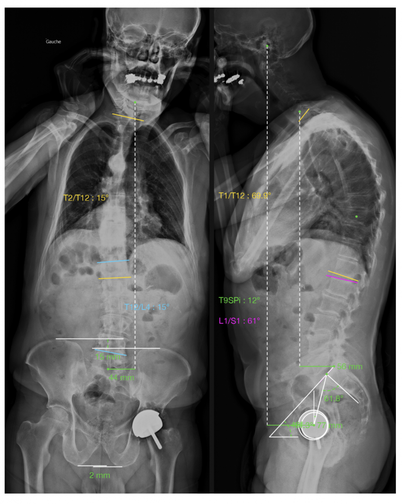 Figure 5: Exemple d’analyse globale d’un déséquilibre rachidien coronal et sagittal de l’adulte