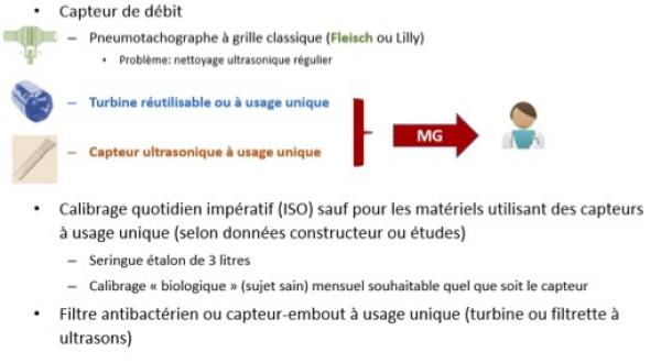 1. Pneumotachographe à grille classique (Fleisch ou Lilly) nécessitant un nettoyage ultrasonique régulier3. Capteur ultrasonique à usage unique2. Turbine réutilisable ou à usage uniqueCes deux derniers sont utilisables facilement par les médecins généralistes.