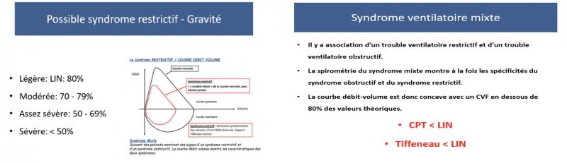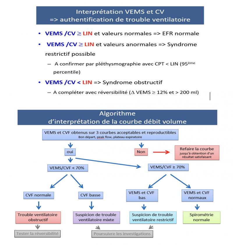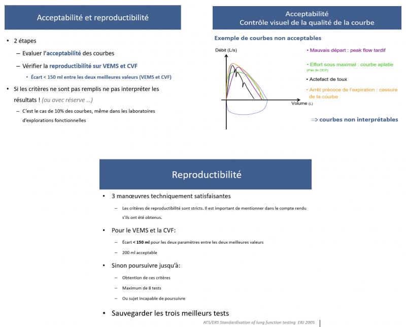 Préalable à l’interprétation des résultats* Il est primordial d’éviter la toux, surtout au début de l’expiration, ainsi que la fermeture de la glotte afin d’assurer la validité des résultats.* Si CVF < CVL => signe de trappage – poumons n’arrivent pas à se vider lors de la manœuvre forcée => « emphysème »* Points critiques :* Inspiration complète et rapide* Absence de pause en fin d’inspiration* Début d’effort expiratoire franc et immédiat* Expiration prolongée jusqu’à la vidange pulmonaire maximale